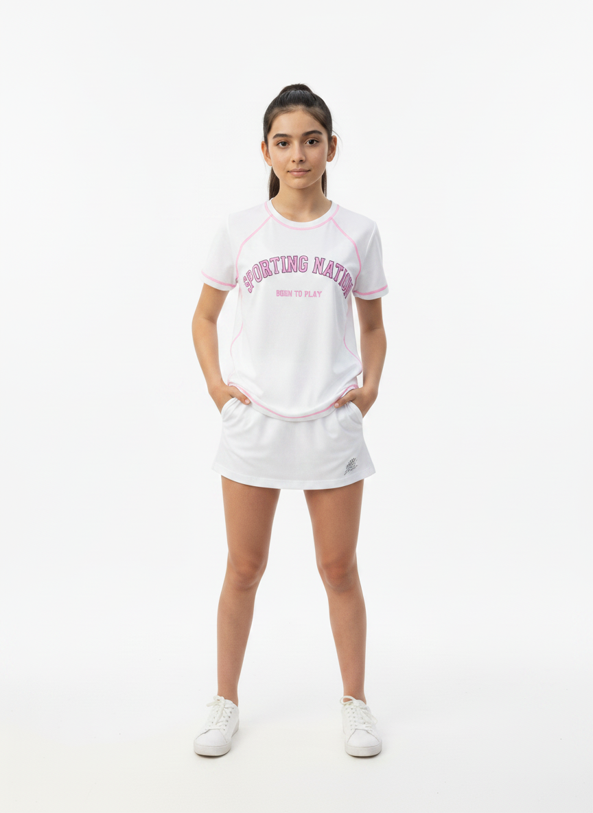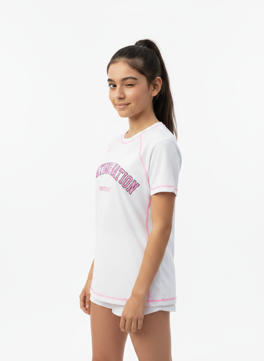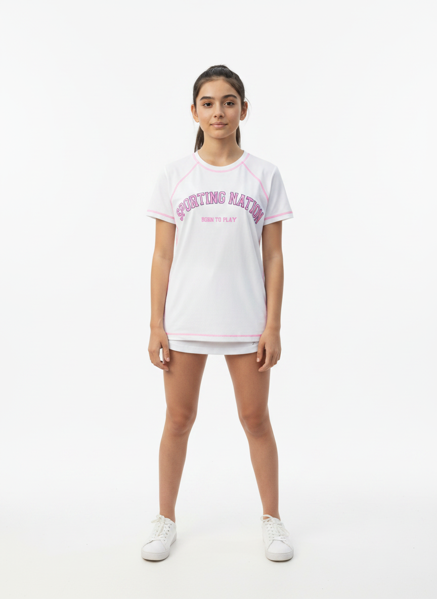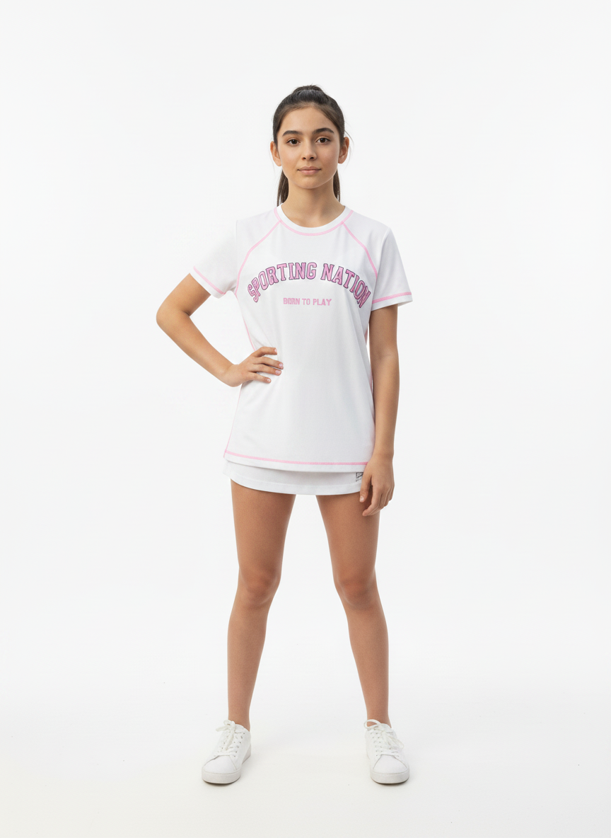 Made from soft, breathable, and stretchable fabric, this white athletic tee ensures all-day ease whether she’s playing sports, heading outdoors, or just relaxing. The contrast pink piping adds a trendy sporty touch, while the bold “Sporting Nation – Born to Play” graphic enhances its athletic appeal.